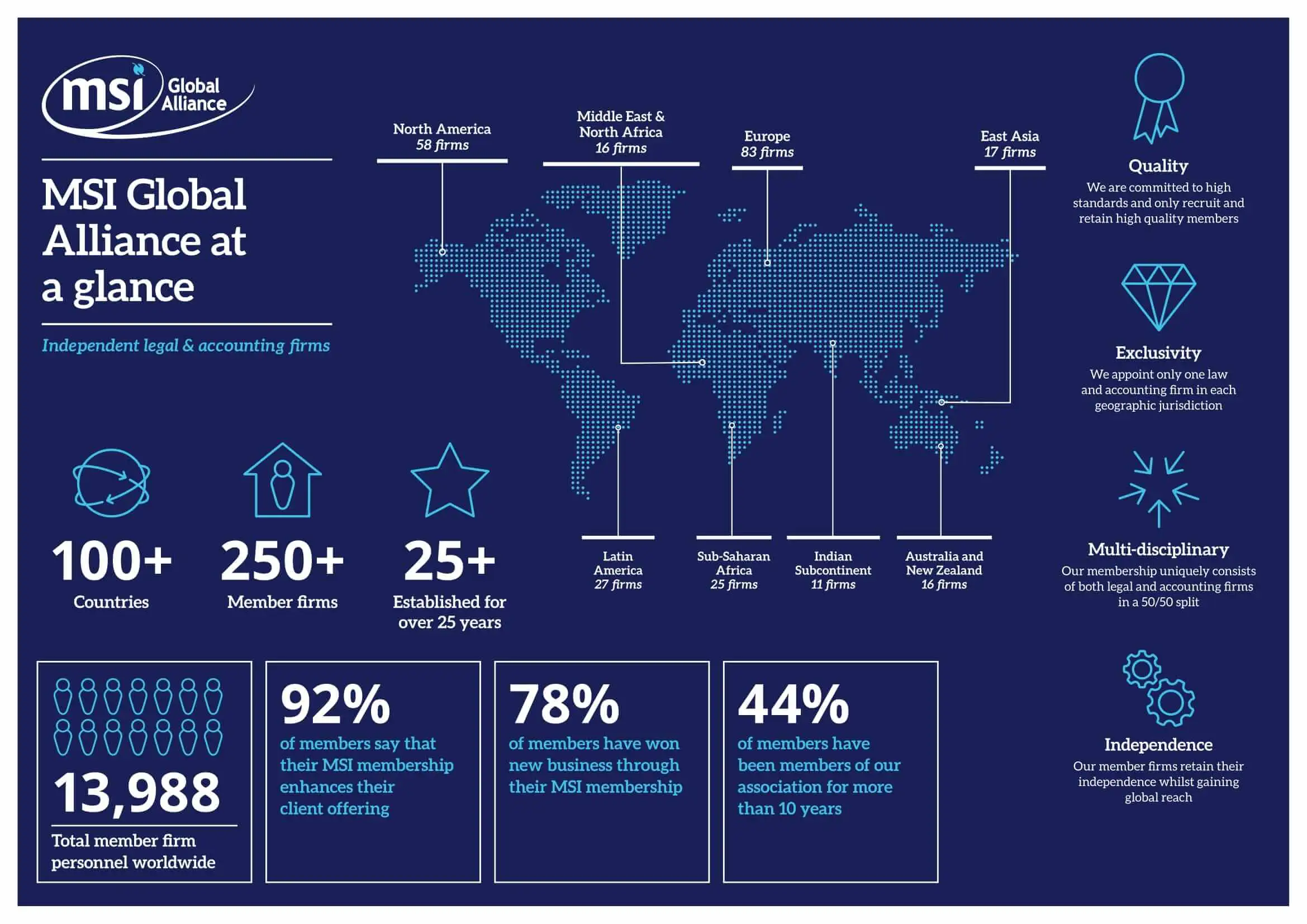 MSI Global Alliance was formed in 1990 in response to the growing need for cross border cooperation between independent professional service firms. MSI has steadily grown to become a leading international alliance of law and accounting firms, with over 250 independent member firms in 100 countries throughout the Americas, Asia-Pacific and Europe, Middle East and Africa.